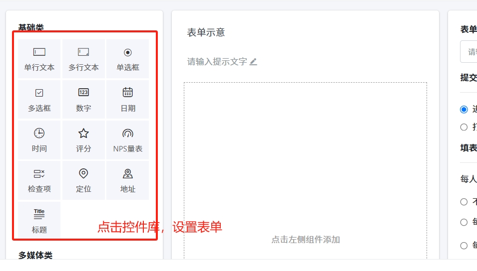 在左边的控件库中,选择需要的功能,点击即可设计表单