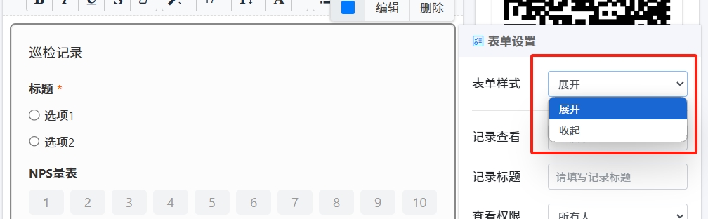 点击模板中的表单,右侧出现表单设置,可以设置为展开模式,即扫码后就显示表单内容
