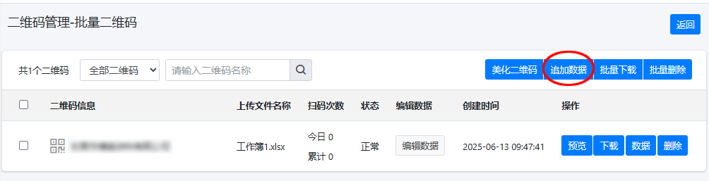 - 首先在后台-活码列表页面找到这个二维码点击进入,然后点击页面右上角“追加数据”